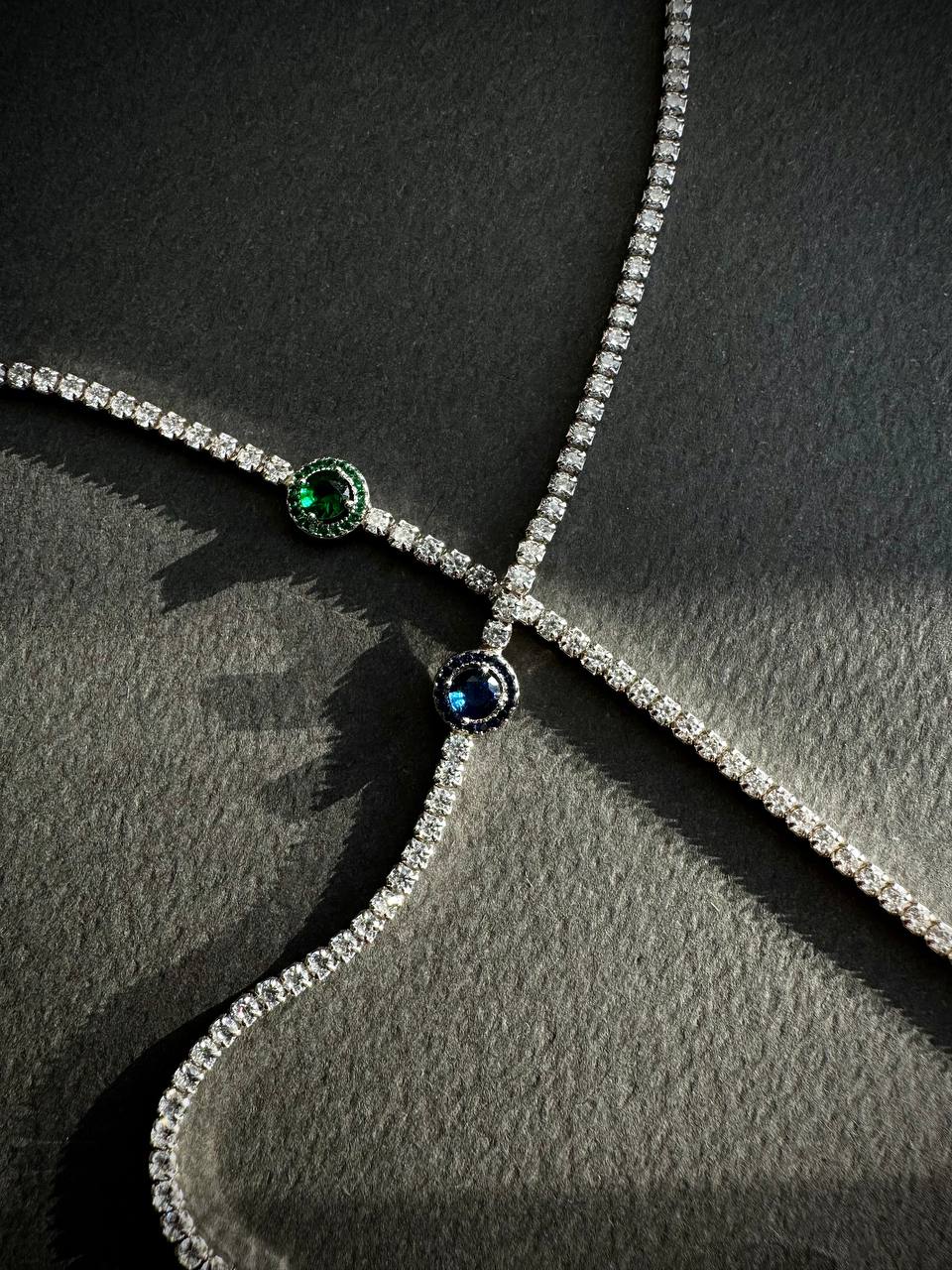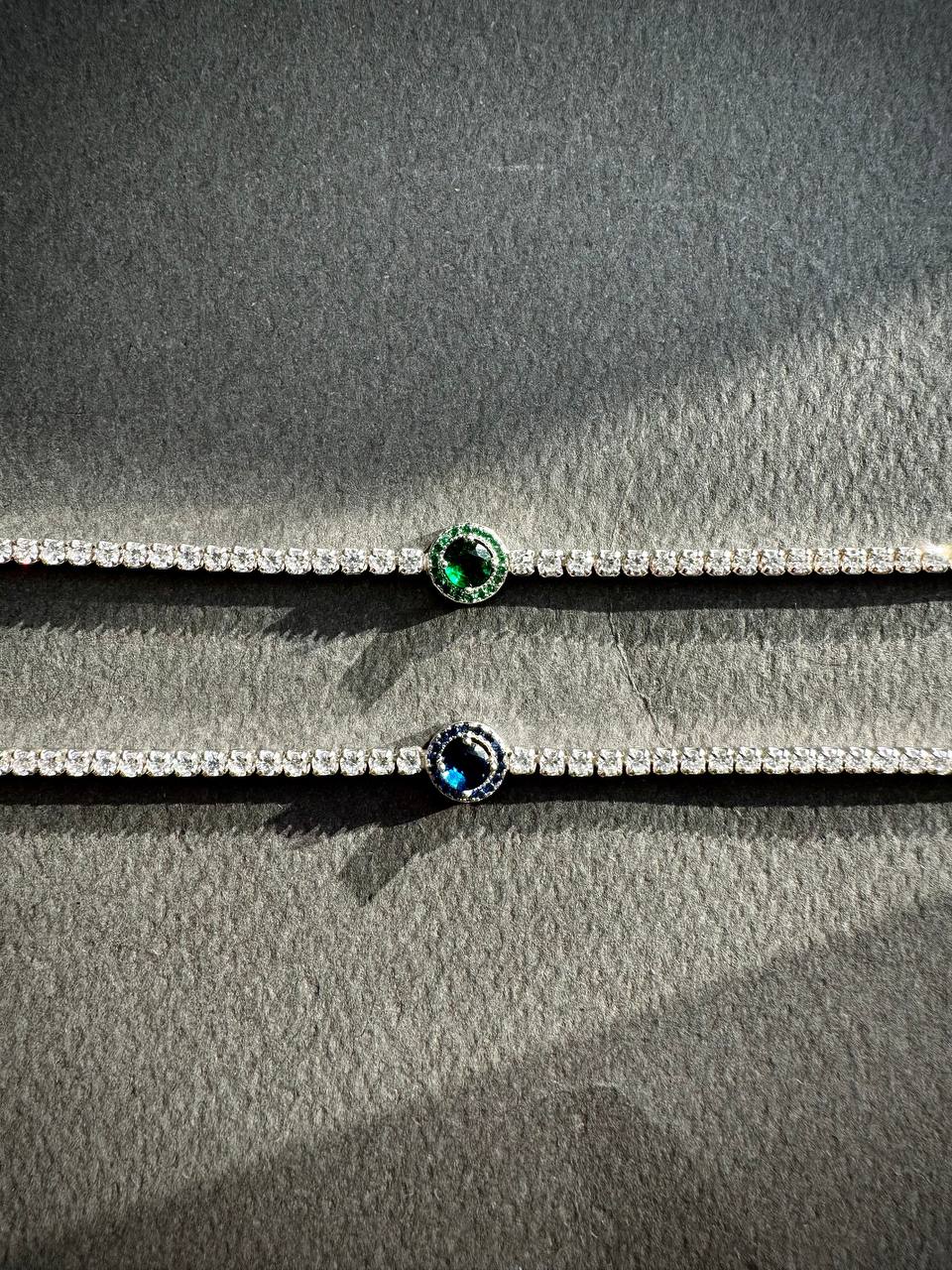 Silver bracelet with green or blue round shaped diamondlite stone