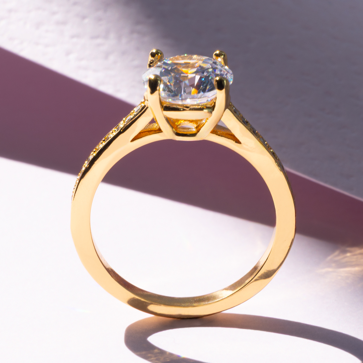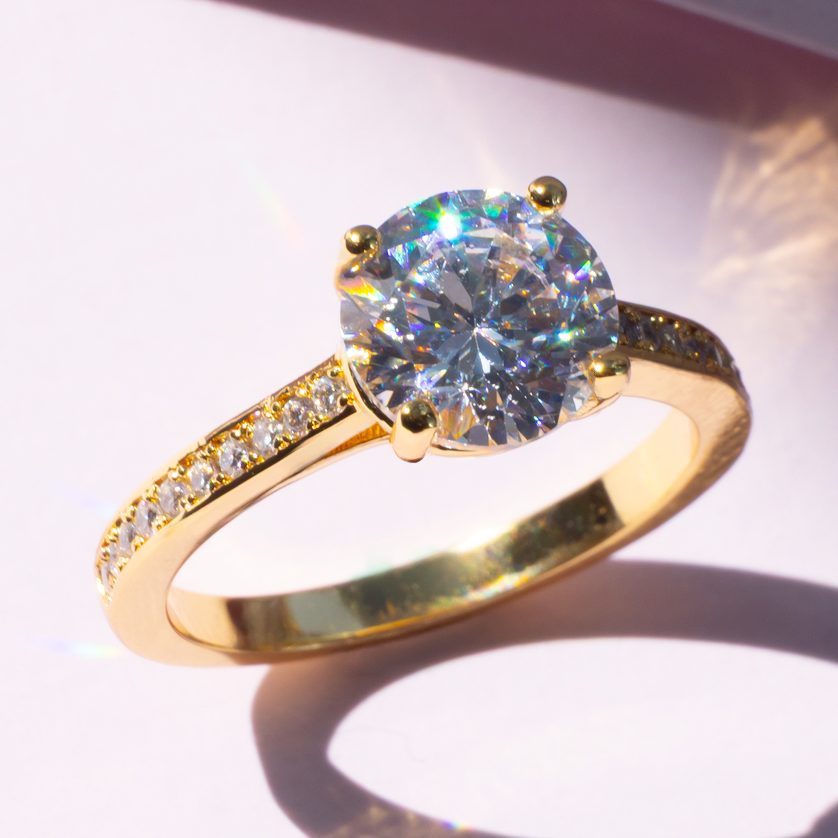 Radiate timeless elegance with this stunning women’s solitaire ring. Forged from high-quality copper and finished with a brilliant gold-tone plating, this design features a large, round-cut Diamondlite center stone that captures and reflects light with spectacular “rainbow” fire. The slender, high-polish band is beautifully enhanced by precision-set Diamondlite pavé accents along the shoulders, adding a sophisticated shimmer to the classic silhouette.