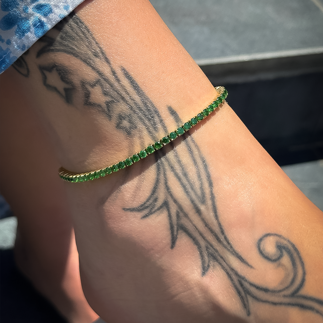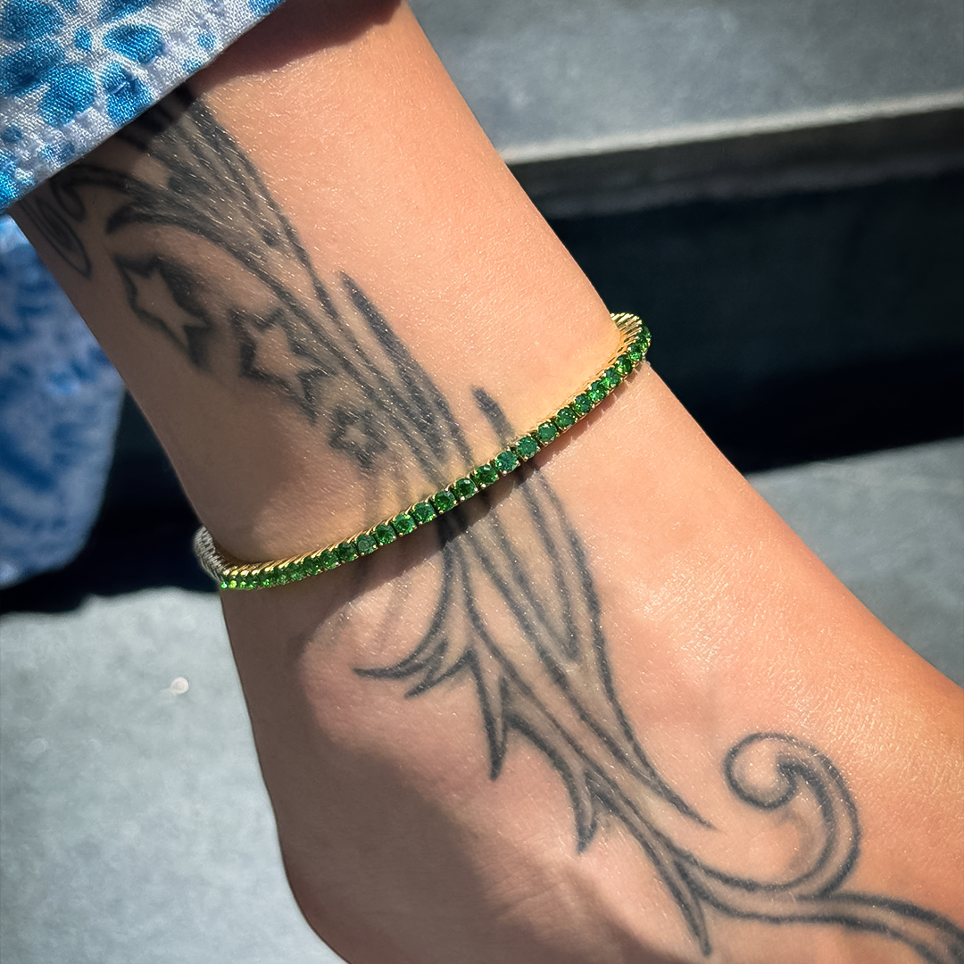 Stainless steel anklet for woman in gold color with green diamondlite stones
