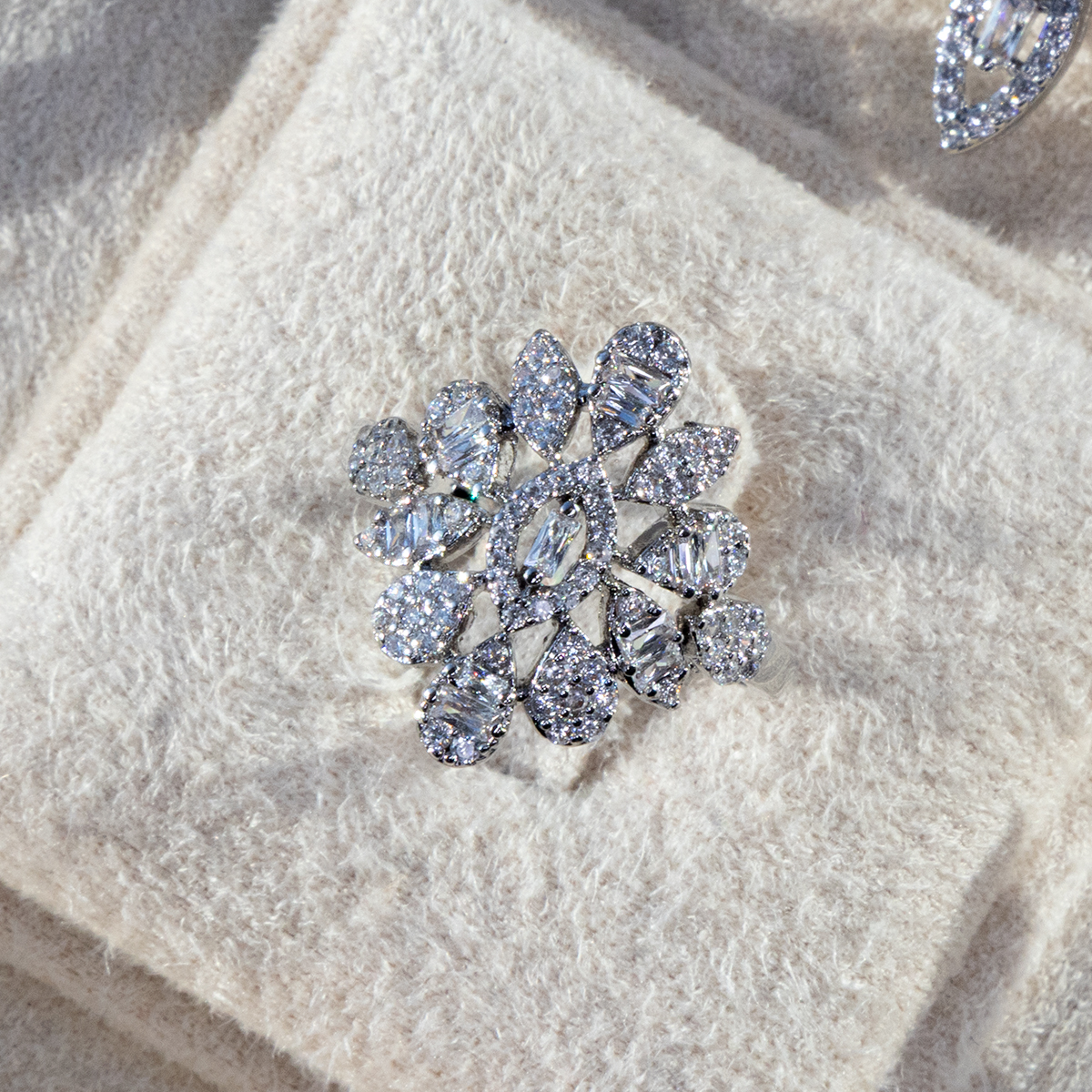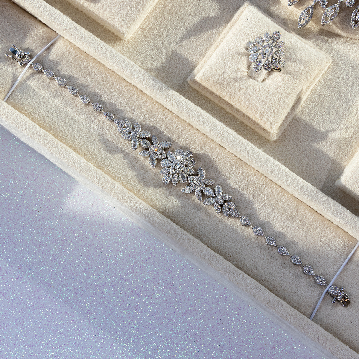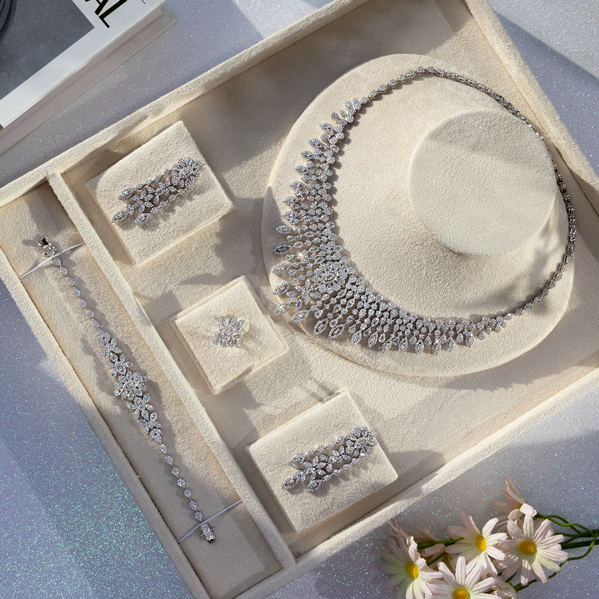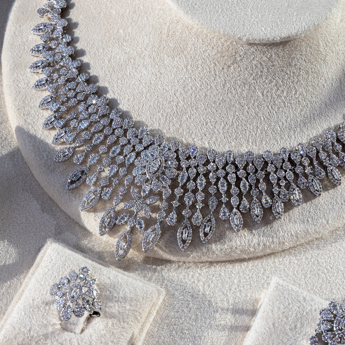 Elegant women’s jewelry set made from copper, featuring a matching statement necklace, earrings, ring, and bracelet adorned with sparkling Diamondlite stones in a refined silver-tone finish. Designed with a luxurious cascading floral/leaf motif and brilliant clustered detailing, this coordinated set creates a glamorous, high-shine look perfect for weddings, formal occasions, parties, and special events. A stunning set made to elevate any elegant outfit.