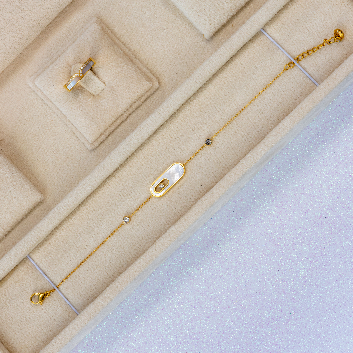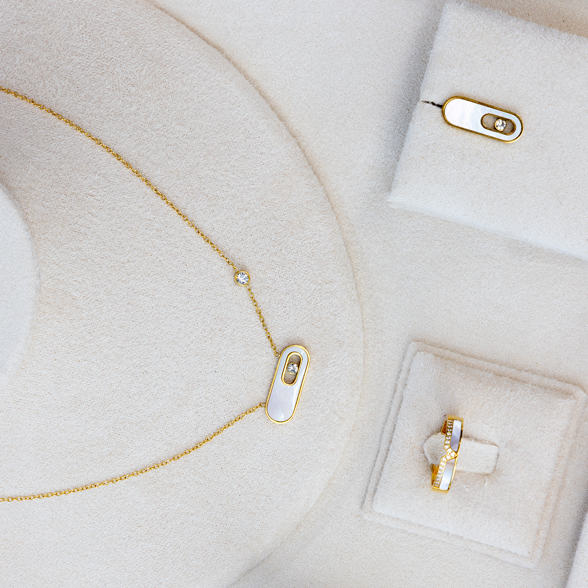 Discover the perfect balance of luxury and resilience with this stunning four-piece jewelry collection. Designed for the modern woman who refuses to choose between style and durability, this set features a sleek, gold-plated 316L Stainless Steel construction. The centerpiece of each design is a lustrous Mother of Pearl inlay featuring a “floating” Diamondlite stone—a premium simulant renowned for its exceptional brilliance and diamond-like fire.